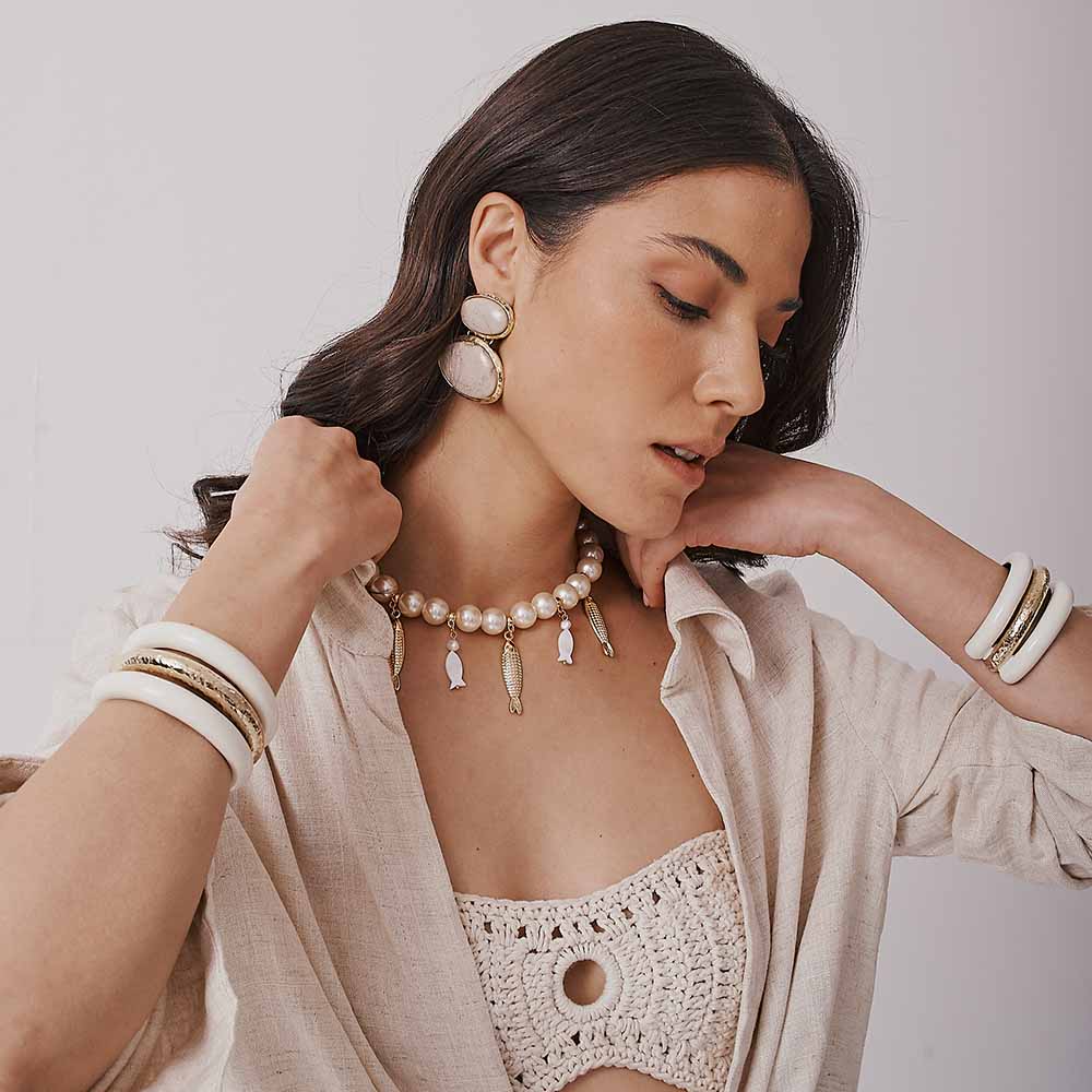 Delicado e cheio de significado, este colar combina a elegância clássica das pérolas com um toque marinho encantador. As pérolas naturais trazem uma sofisticação atemporal, enquanto os pingentes de peixes e elementos dourados remetem à leveza, à fluidez e à conexão com o mar. Uma peça que traduz harmonia entre o luxo e a natureza — perfeita para quem busca um acessório único, cheio de estilo e simbologia.