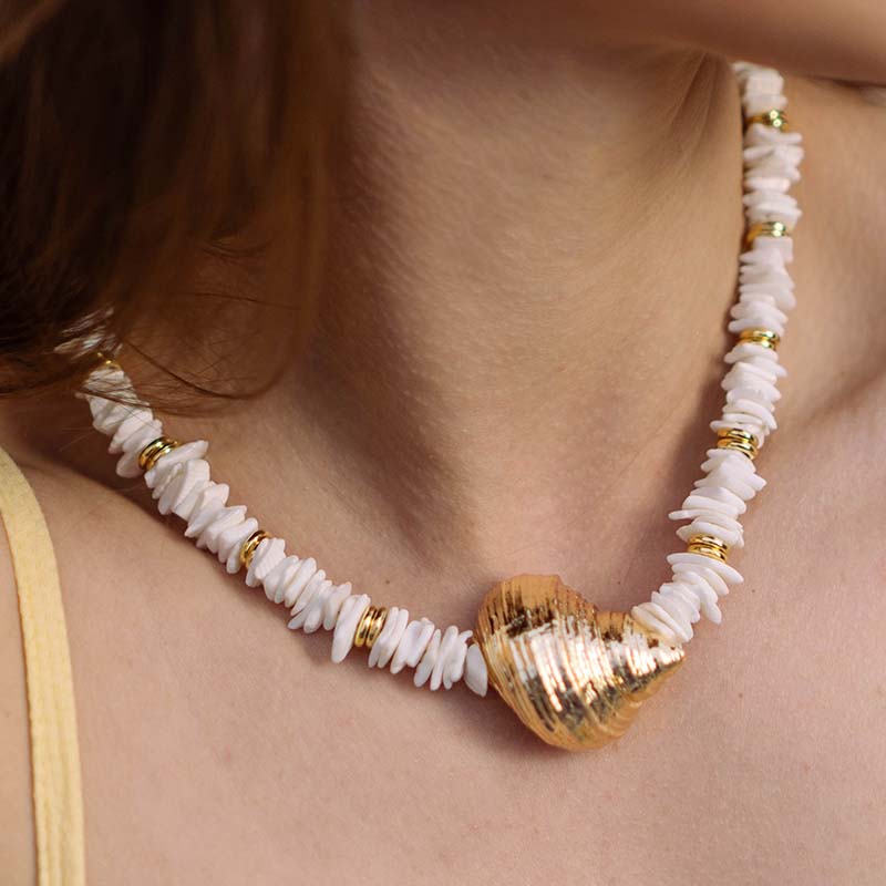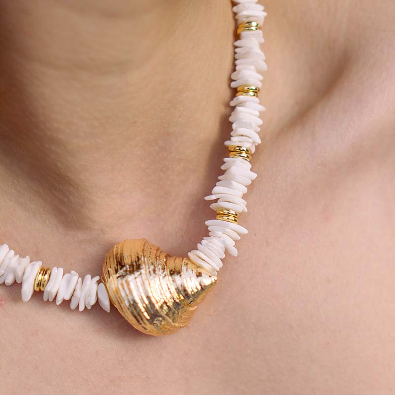 O Colar Madri Cascalho Concha Ouro é uma peça cheia de personalidade e charme natural. Inspirado nas paisagens do Mediterrâneo, ele combina cascalhos brancos com delicados espaçadores dourados, culminando em um pingente de concha banhado a ouro que transmite elegância e sofisticação.
