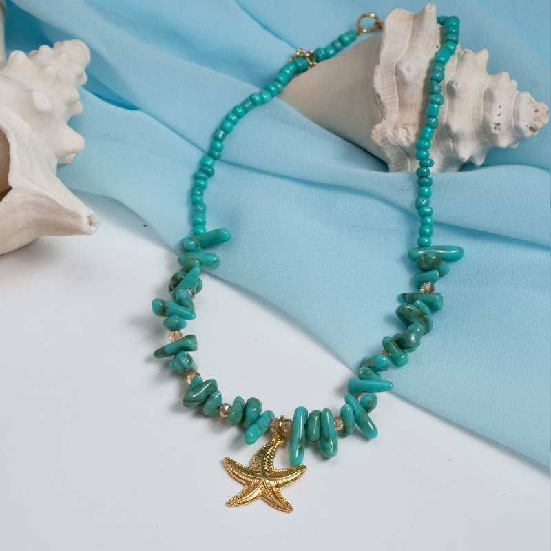 Inspirado na força e na beleza do oceano, o Colar Maré Turquesa é uma bijuteria artesanal feita com miçangas e pedras em tons de azul-turquesa, destacando um elegante pingente dourado em formato de estrela-do-mar.